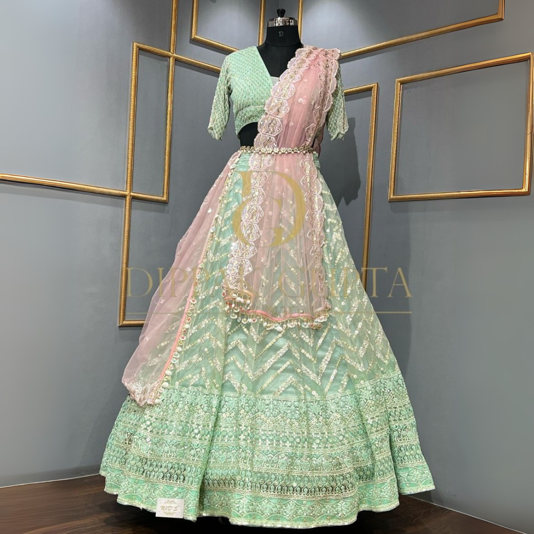 Sea green thread embroidery lehenga
